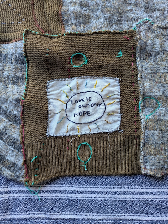 【NoborderARTPROJECT】 セカンドハンド(中古)のニット2着を解体し1枚のニットキルトを再構築しました。着用感のあった箇所は除けてカットオフしミシンと針と糸で製作しています。製作の序盤にミシンが故障してしまい、中盤から針と糸での表現も加わりました。整っていないたどたどしい縫い目がなんだか自分らしいなと思っています。ニットキルトに縫い付けたデニムのハギレは循環素材です。アートプロジェクトに共鳴してくださったSさんからシェアいただいた素材です。Sさんありがとうございます。すこしずつ、大切に使わせていただいています。刺繍布パッチは現在販売しているものの中から選びました。現在の心境や今回の表現にぴったりだと感じた「Love is our only HOPE」今回製作したニットキルトは売上のうち400円を国境なき医師団へ寄付します。寄付型刺繍布パッチは他のデザインも有り、現在数枚ほどですが販売しています。(1枚500円で販売し売上のうち400円を寄付します)刺繍布パッチは随時製作をして追加中。お問合せは Instagram→@ki_ssa_ko2022 まで。 自分のこの両手で、たがが外れつつある世界に対して何ができるだろう..と考えて考えてはじめた小さき者の小さなアクションです。 再構築キルト ●Size - 165×67 (cm)○素材 - ウールなど ○お手入れ-ネットに入れて穏やか短時間モードで洗う。手洗いの場合は中性洗剤もしくはおしゃれ着洗い用の洗剤で優しくささっと押し洗いし脱水したのちカタチを整えてから陰干しすることをおすすめします。 #mending #sashiko #upcycle #rework #fashion secondhand noborderartproject remake tellmeyourfavoritesong ? tellmeyourfavoritethings ?