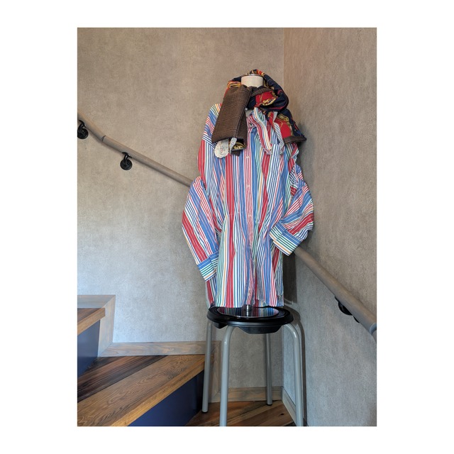 【New in.】【Re:bornPROJECT】 セカンドハンド(中古)のシャツはリサイクルショップで奇跡的に遭遇しました。Bigサイズゆえに、取り残されてしまったのかなぁと思ったり。ならば . . 着られるようなサイズに手を加えてみたいなと思い、、ミシンの力を借りてつまんでは縫う方法で自由に手を加えてみました。(前後とも着ることができるようなデザインを目指して手を加えてみました)首に巻かれたキルトは、スカーフを解体しウール混の布生地と重ねました。スカーフはシェア素材です。(Nさんありがとうございます)スカーフを解体し、音楽を聴きながら、そのとき自分のなかで生まれた感覚で、配置をしました。スカーフの再構築。偶然生まれるデザインがとても楽しく面白かったので、またチャレンジしてみたいと思っています。 [New in.] [Re:born PROJECT] I miraculously came across this secondhand shirt at a thrift store. I wondered if it had been left behind because it was too big. So, I wanted to modify it to make it more wearable, so I used a sewing machine and pinched and sewed it freely. (I was aiming for a design that could be worn both front and back.) The quilt around my neck was made by disassembling a scarf and layering it with wool-blend fabric. The scarf is made from sheer material. (Thank you, N-san ) I disassembled the scarf and, while listening to music, arranged it according to the instincts that arose within me at the time. Reconstructing the scarf. The designs that emerged by chance were so much fun and interesting, and I'd like to try it again. ●肩幅50●袖丈53●着丈90●身幅40 (cm) ●ドローストリング入 ○素材-綿 ○お手入れ-ネットに入れて穏やか短時間モードで洗う。手洗いの場合は中性洗剤もしくはおしゃれ着洗い用の洗剤で優しくささっと押し洗いし脱水したのちカタチを整えてから陰干しすることをおすすめします。