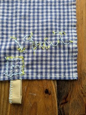 循環素材でバンダナサイズのマルチキルトを製作しました。顔や首元に巻いたり、お弁当箱や本を包んだり、手を拭いたり、暮らしの場面で多目的に使えるようなキルトをイメージしてつくりました。ループ部分に縫い付けたのは愛知県豊田市に工房を構える「mateini」さんの唯一無二のさをり織りハギレです。刺繍した言葉「Jump!」は Van Halen 「Jump」を聴きながら前向きな気持ちを込めました。下を向きたくなるようなことがあっても、そんなことも飛び越えてしまうくらいの、つよくてたくましくて前向きな気持ちを込めて。