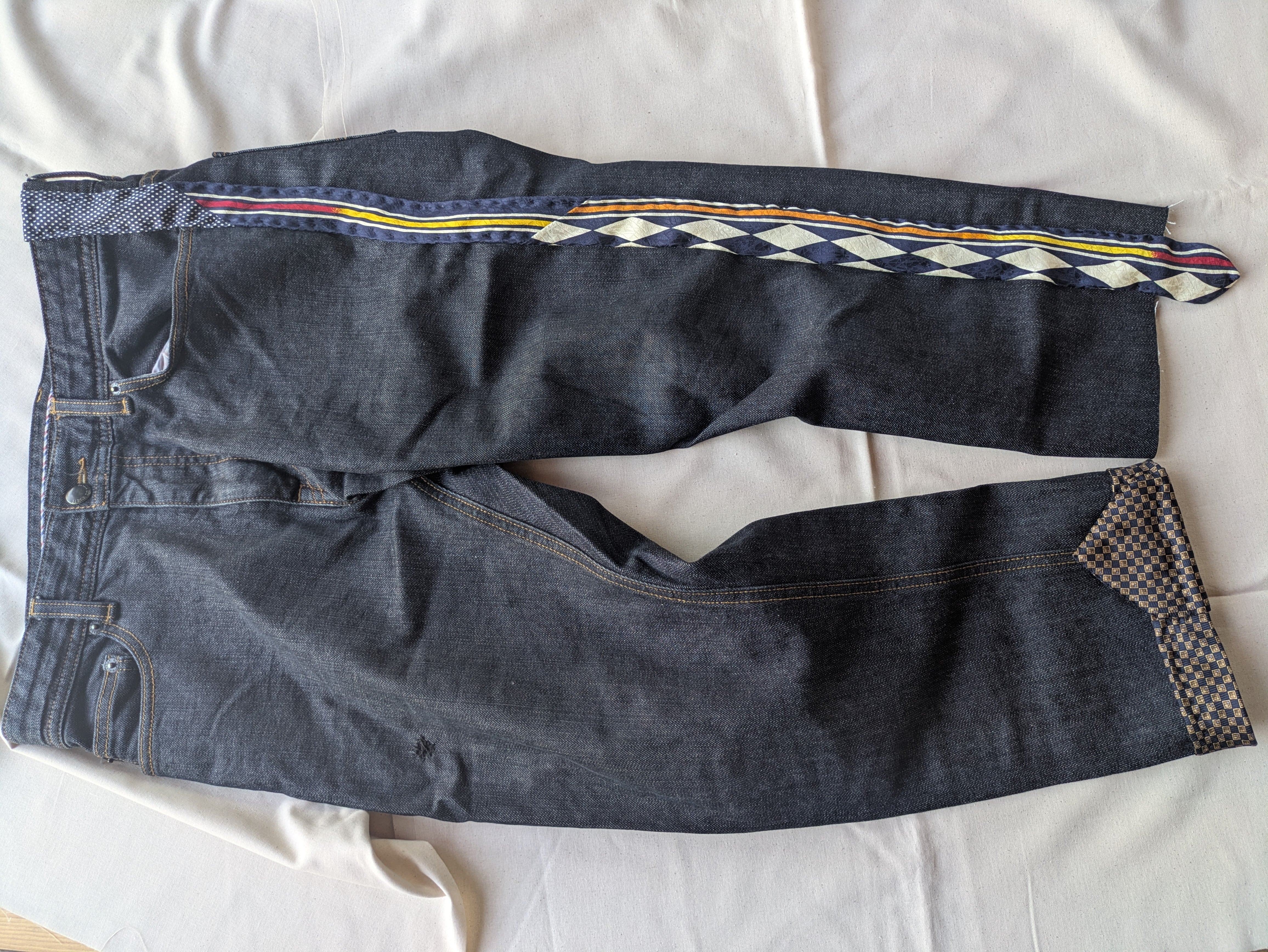 セカンドハンドのインディゴデニムをメンディングしました。メンズサイズのデニム。長めだった裾をカットしてネクタイを縫い付けました。ほんの少しサルエル風シルエットになっています。ウエストをベルトで固定することで女性も着用可能かと思います。デザインがとても素敵なネクタイはすべて手縫いで取付け。インディゴデニムと幾何学的紋様のネクタイの組合せ、可愛いなぁ、と思います。