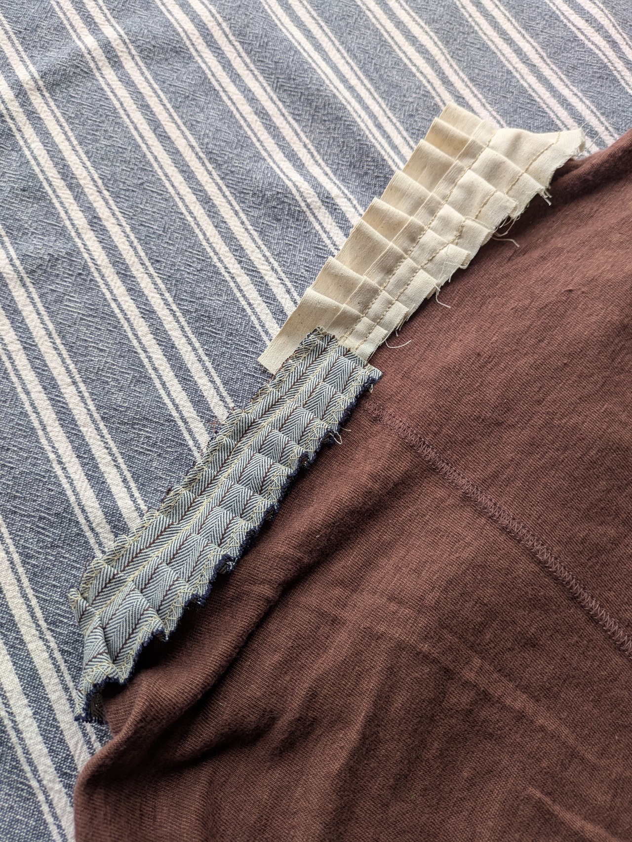 I mended a secondhand (used) T-shirt. It was made of a soft, flowing linen fabric. Since the neckline showed some signs of wear, I added a ruffle. The ruffle was made by pinching scraps of fabric and sewing them with a sewing machine. It was a simple process, but that simple process resulted in a completely unexpected and cute shape. Every time I make something, I end up with a fair amount of fabric scraps, and I want to use up as many of these lovely pieces as possible. This project made me realize that scrap ruffles could be a great way to do that. I think I'll continue making scrap ruffles in the future.