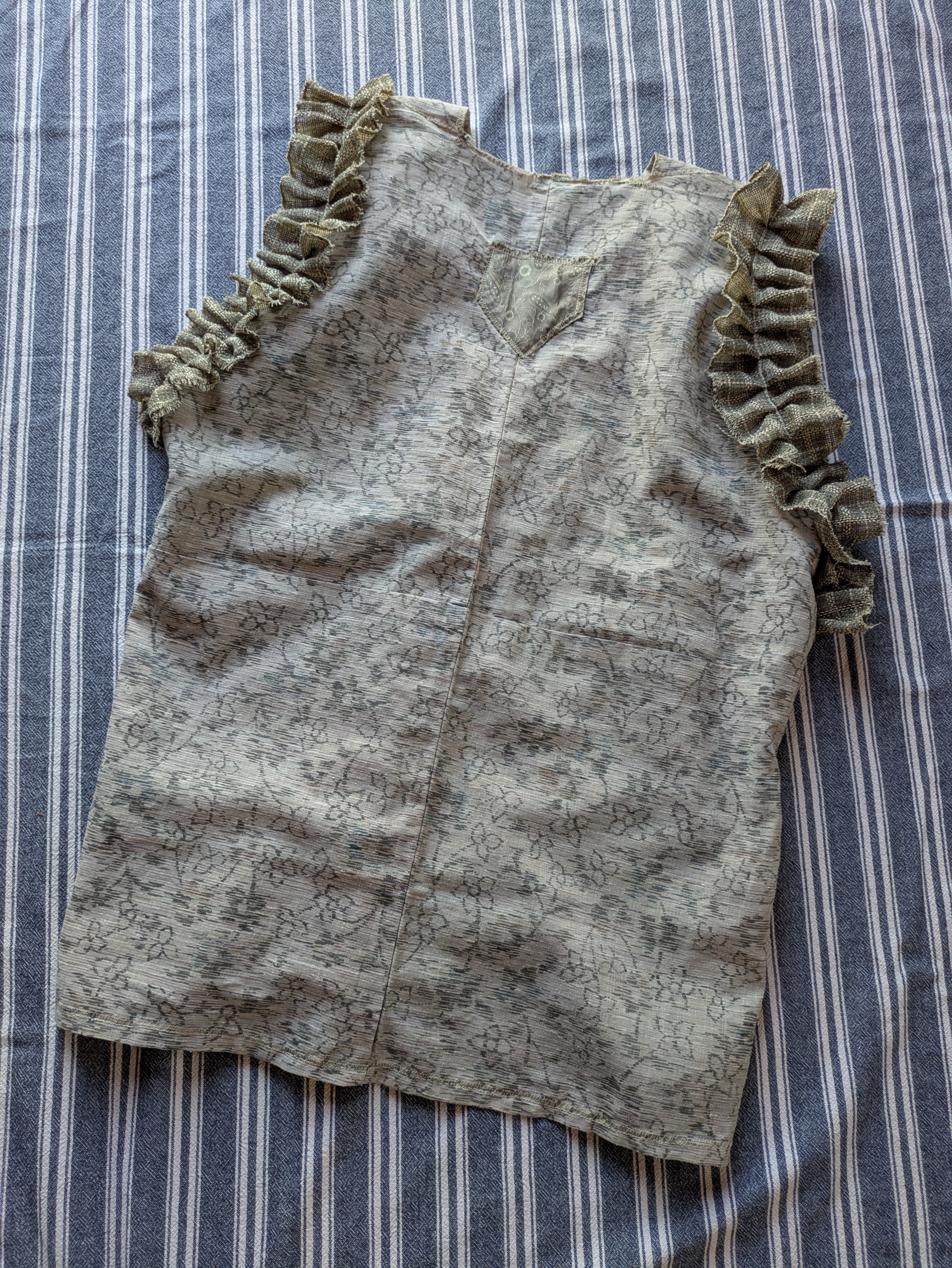 I created something resembling a long vest using recycled kimono fabric. The kimono had no sleeves, and when I first saw it, I thought it looked a bit like a vest. So I decided to add some tweaks, like folding the collar and adding pockets. I used sheer scraps of fabric to create the ruffles, which I machine-sewed into a frilly shape. My favorite part is the gold pocket. I disassembled a tie to create the pocket and sewed it on. Looking at the back of the disassembled tie, I was surprised to see a sparkling gold color. I personally thought the color of the back was amazing, so I arranged the fabric so that both sides were visible and created the pocket. Which is the front and which is the back? Freeing yourself from the idea that things "should" be a certain way might reveal a broader and more free perspective. Are fixed concepts and common sense really going to continue to be common sense forever? There may be times when you don't want to think about it because you're pressed for time, but I think it's very human to bask in the sun and get lost in thought while swaying in the breeze. I've included a video of it being worn on the last page. I hope it will be helpful.