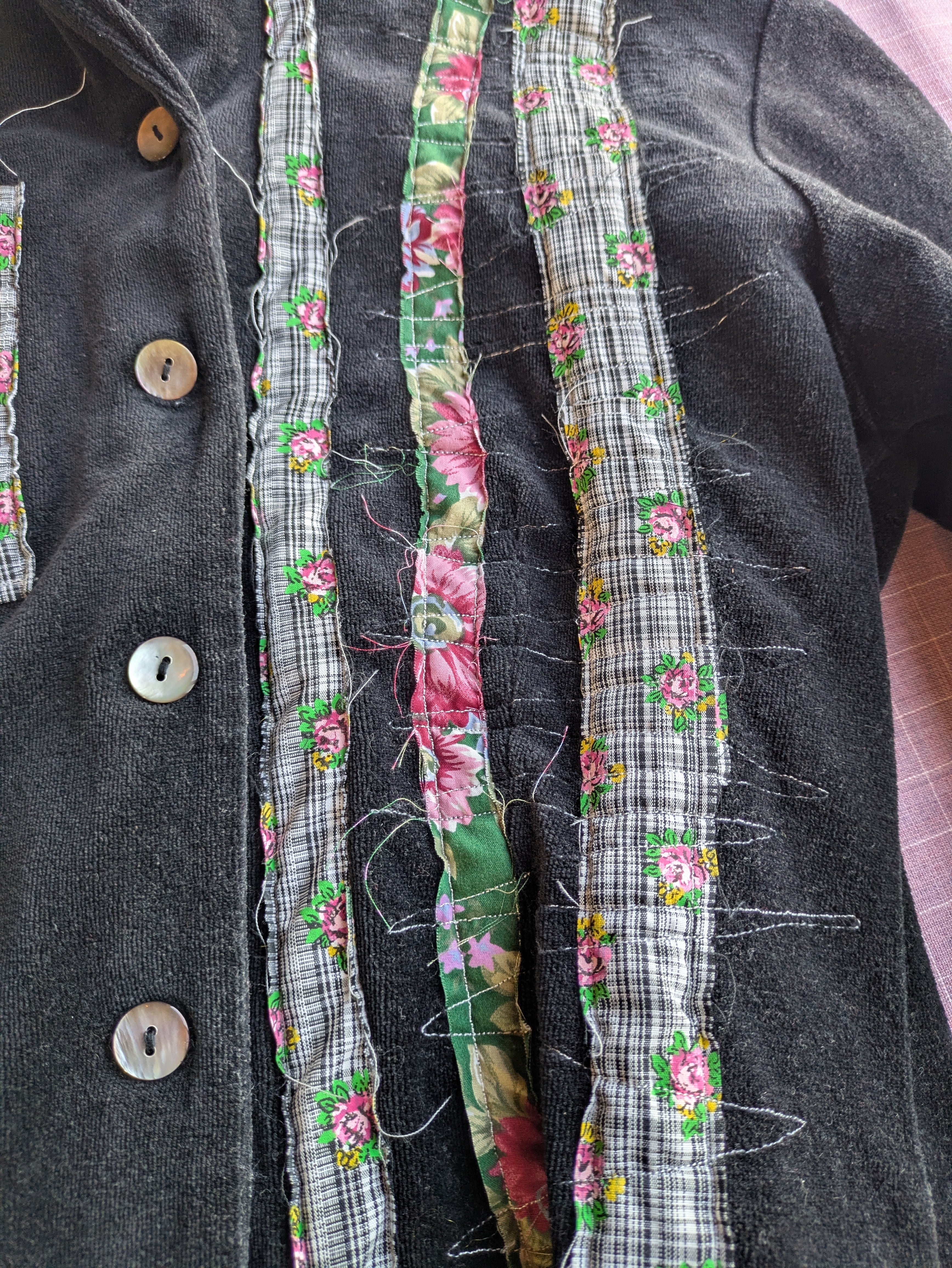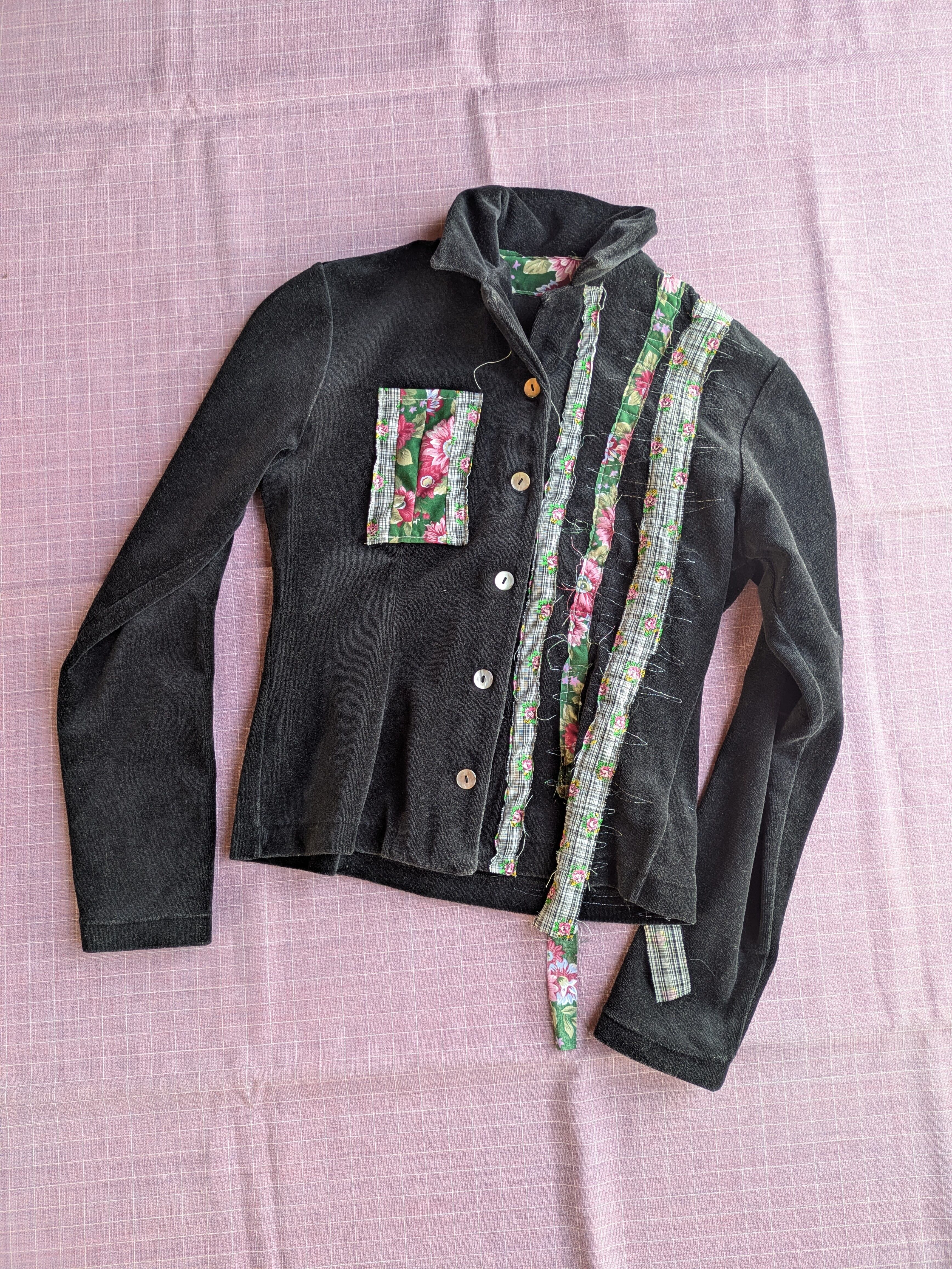 I mended a secondhand velour top. I sewed strips of fabric onto the front and back, where the fabric was a little worn, and then used a sewing machine to sew a zigzag pattern over the top. When using a sewing machine, I tend to feel the need to sew neatly and neatly, but since there are professionals in the field who can do that, I prefer to just enjoy sewing freely without worrying too much about that. Personally, I'd like to try mending something like a costume that makes you wonder, "Who would wear this?" I'll make my dreams come true one by one.