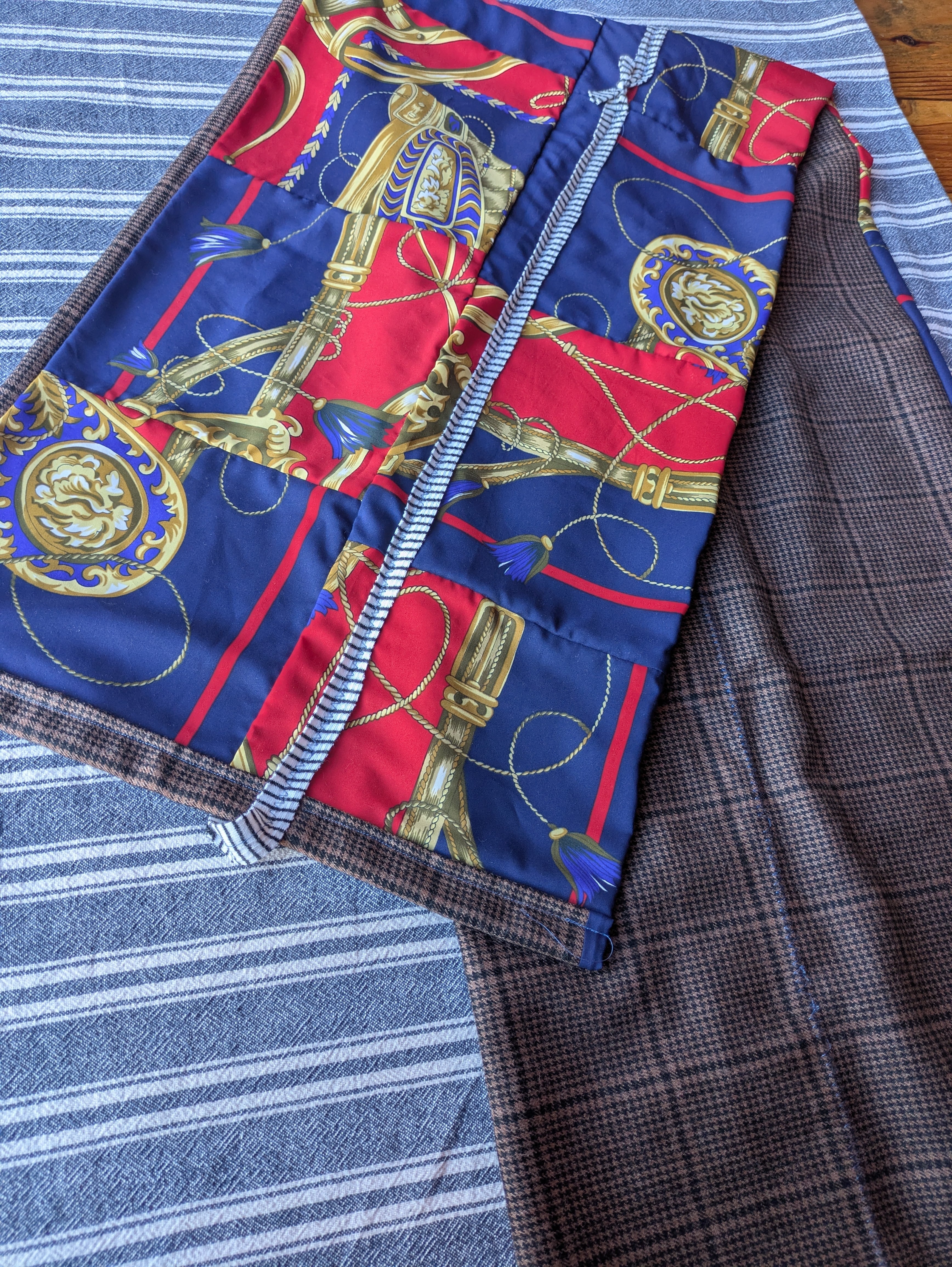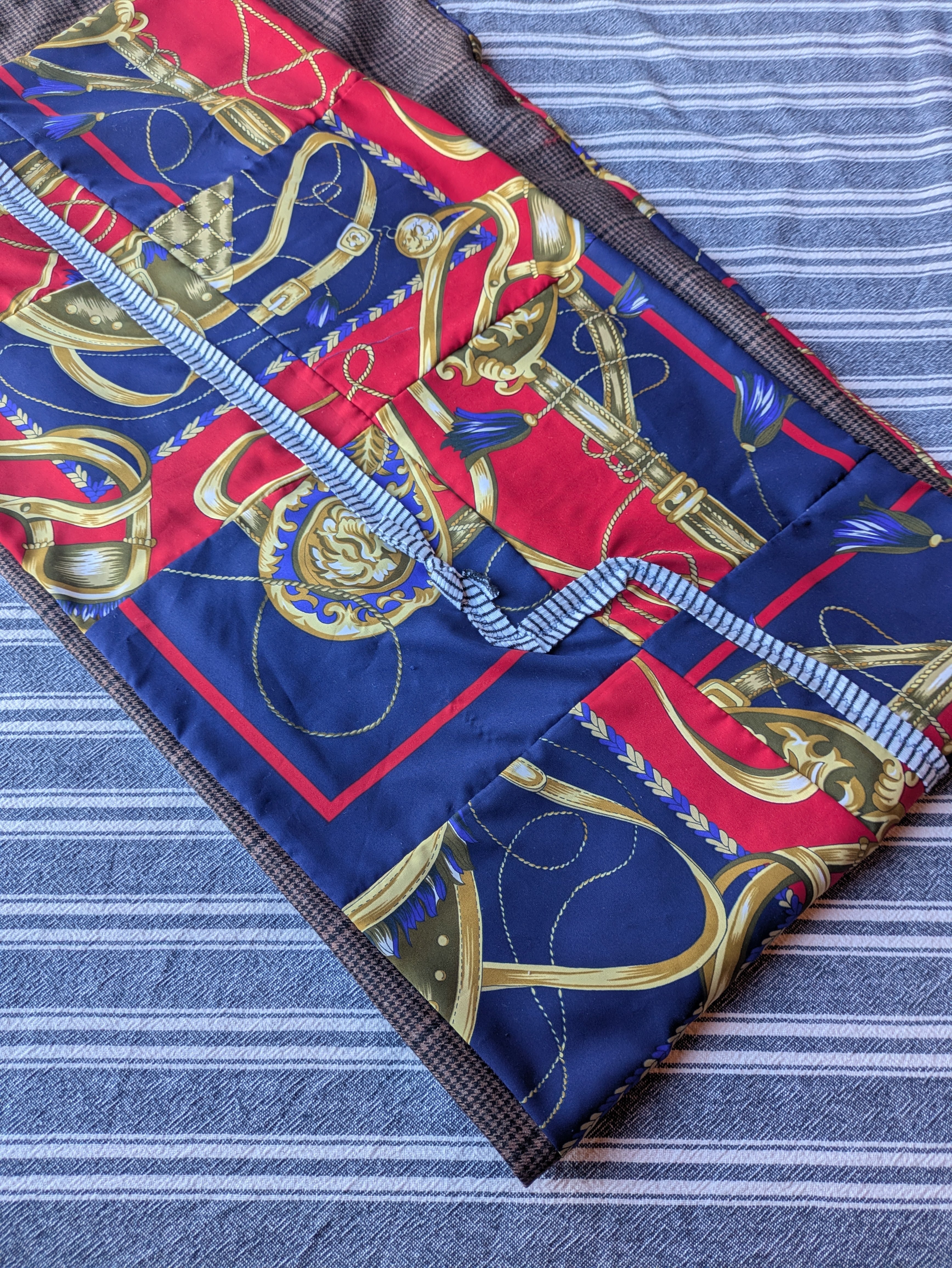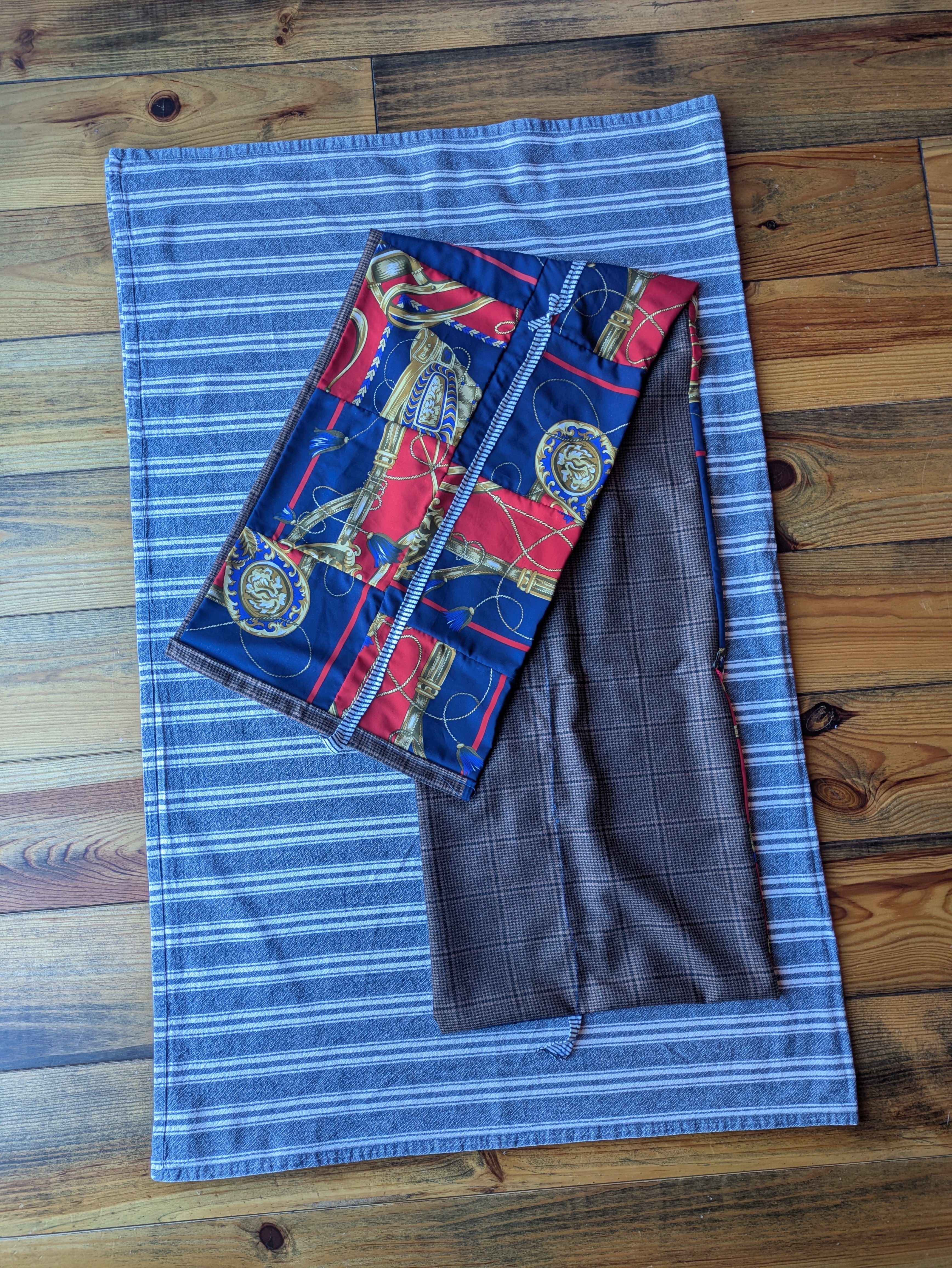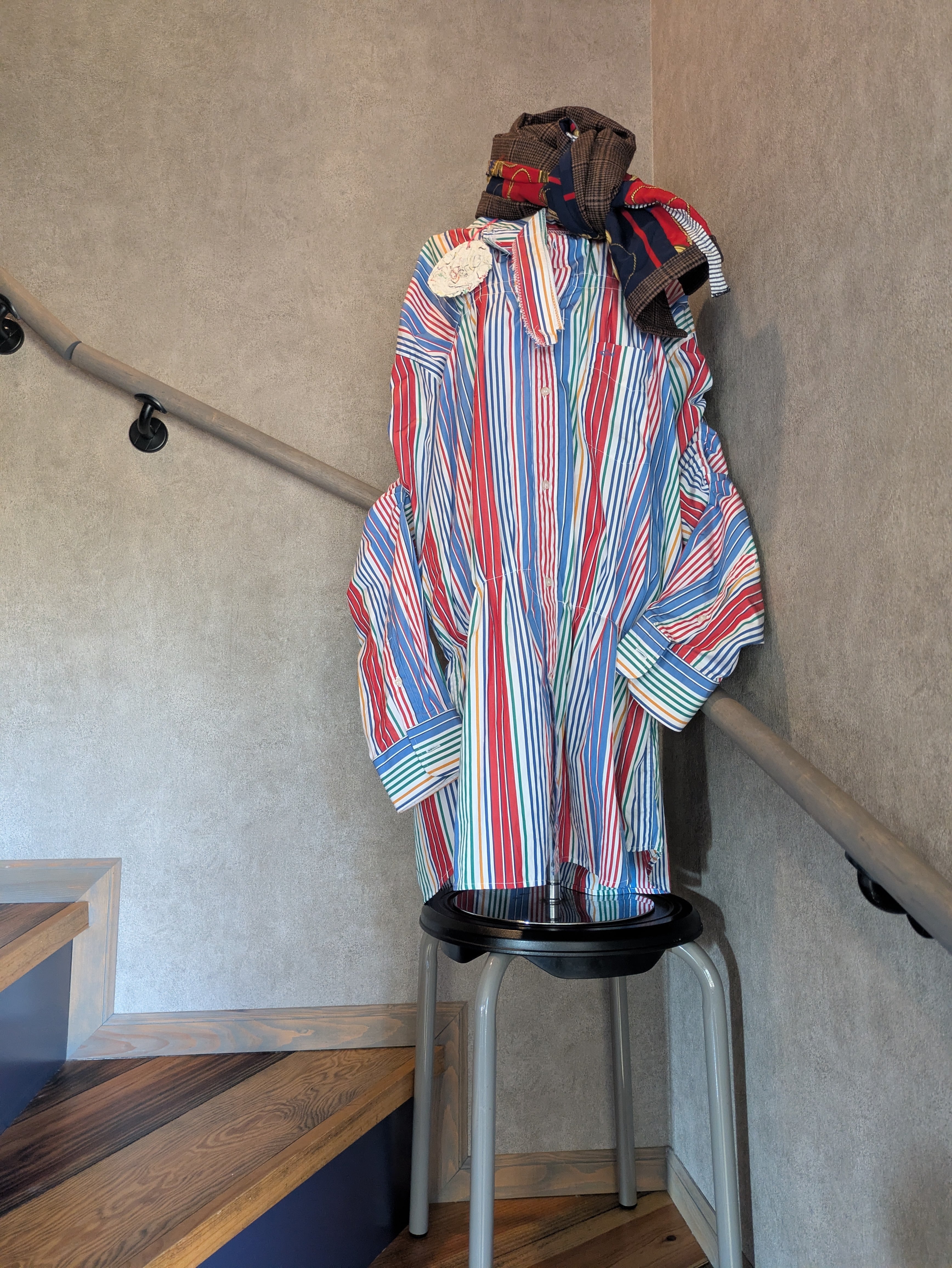 I miraculously came across this secondhand shirt at a thrift store. I wondered if it had been left behind because it was too big. So, I wanted to modify it to make it more wearable, so I used a sewing machine and pinched and sewed it freely. (I was aiming for a design that could be worn both front and back.) The quilt around my neck was made by disassembling a scarf and layering it with wool-blend fabric. The scarf is made from sheer material. (Thank you, N-san ) I disassembled the scarf and, while listening to music, arranged it according to the instincts that arose within me at the time. Reconstructing the scarf. The designs that emerged by chance were so much fun and interesting, and I'd like to try it again.