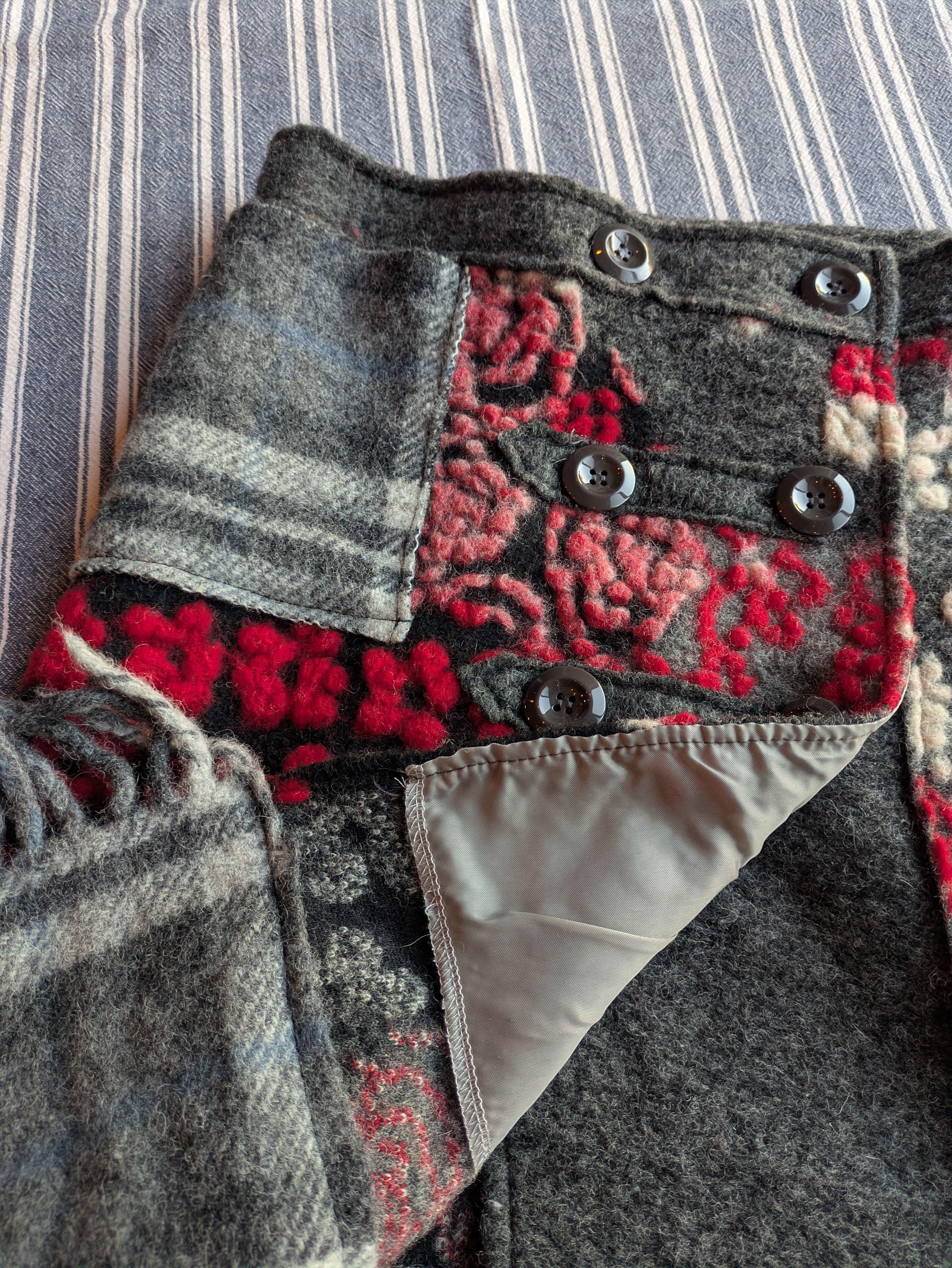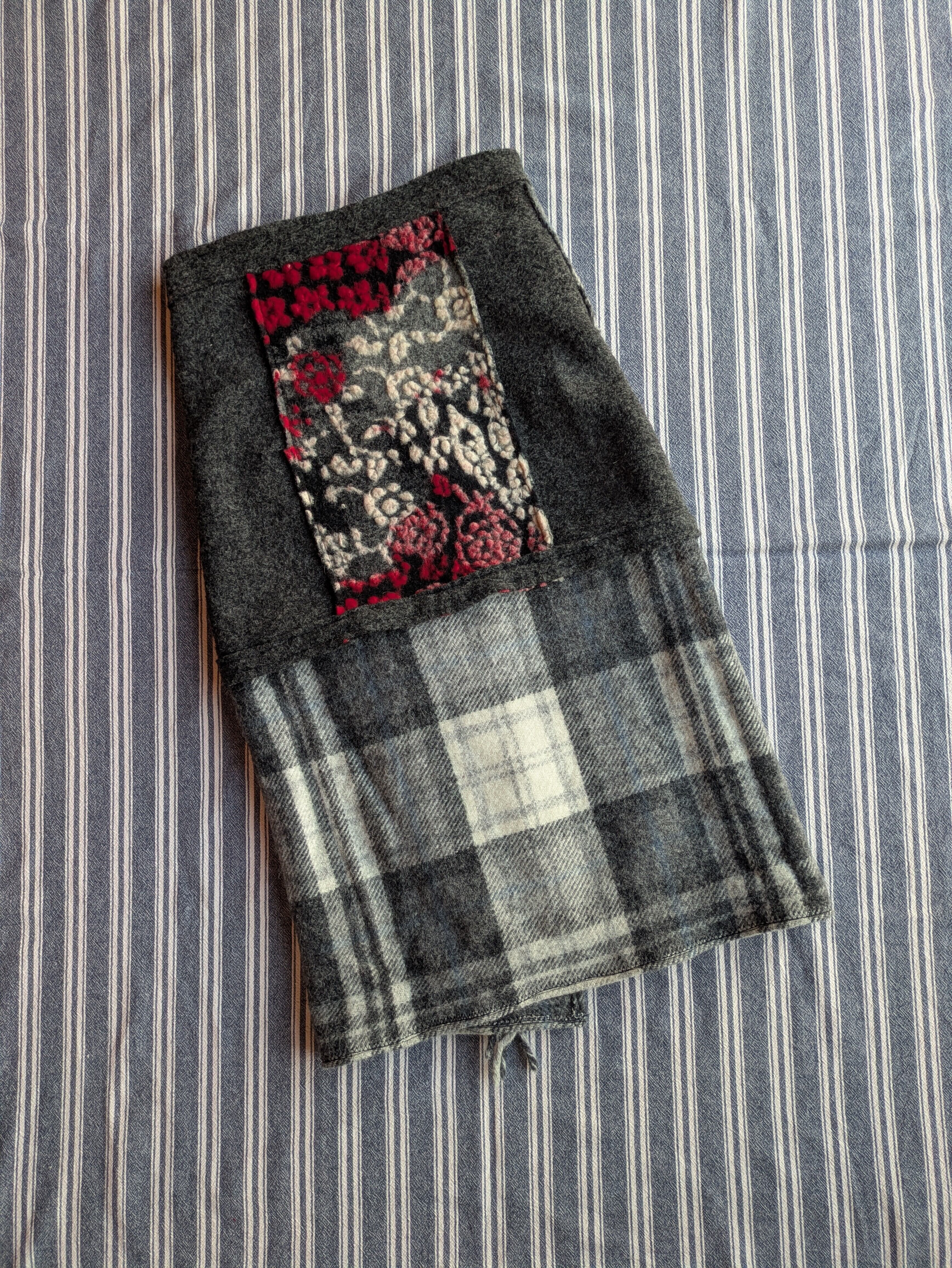 I made a long skirt by combining a secondhand (used) large scarf with a wrap skirt made from recycled materials. The before picture shows a mini-length wrap skirt. I cut the scarf and added pockets and mended it to make it longer. Since it's made of wool, I think it provides quite a bit of protection from the cold. I recommend a quick hand wash, reshape it, and then hang it to dry. It would also be fun to wear it layered over pants.