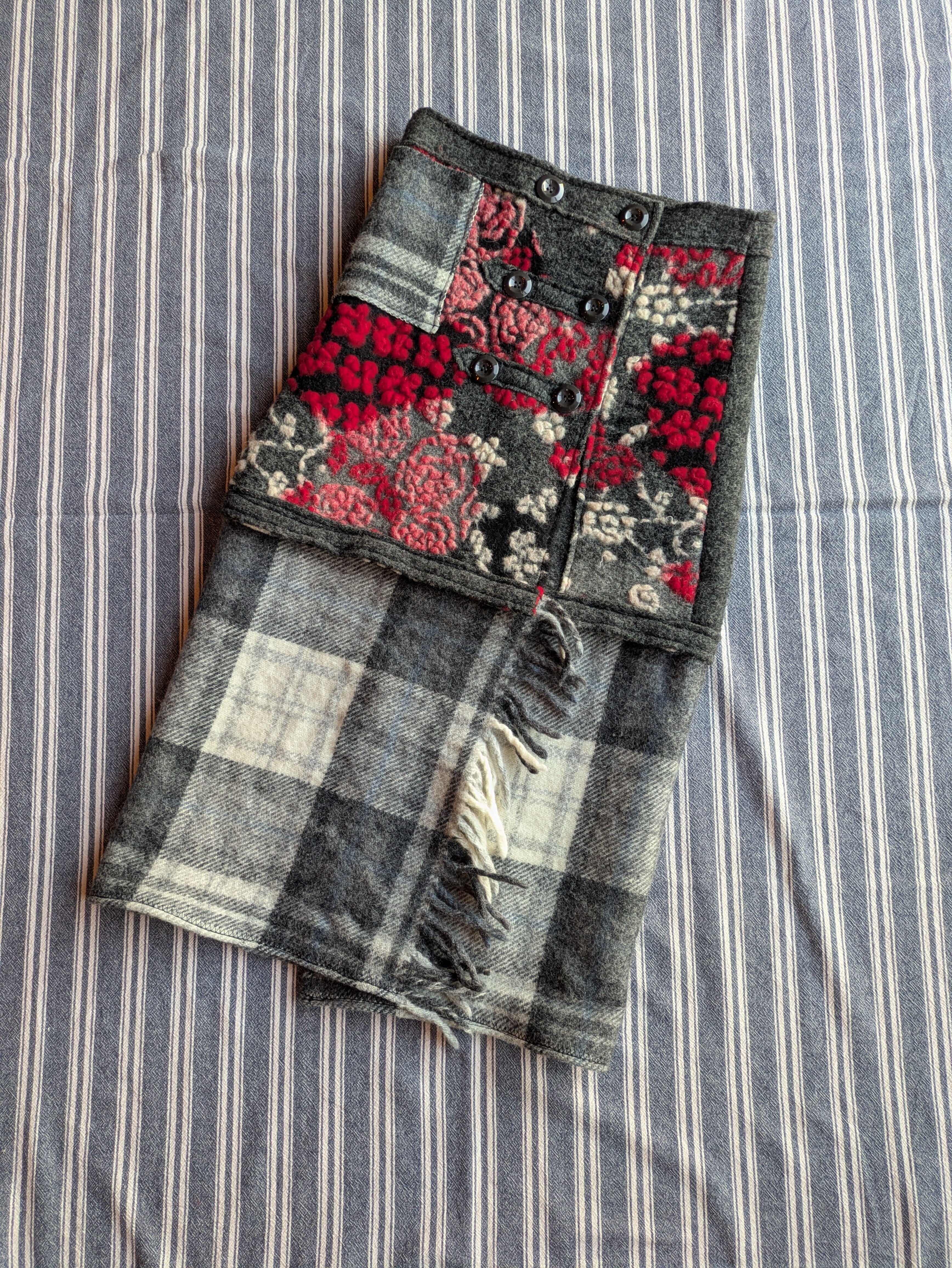 セカンドハンド(Used)の大判マフラーと循環素材のラップスカートを組合せてロングスカートをつくりました。Beforeはミニ丈のラップスカート。マフラーをカットしてポケットを付けたりロング丈へメンディングしてみました。ウール素材なのでけっこう防寒性もあると思います。お手入れはささっと手洗いし形を整えてから干すことをおすすめします。パンツの上から重ねて着たりするのも楽しそうです。