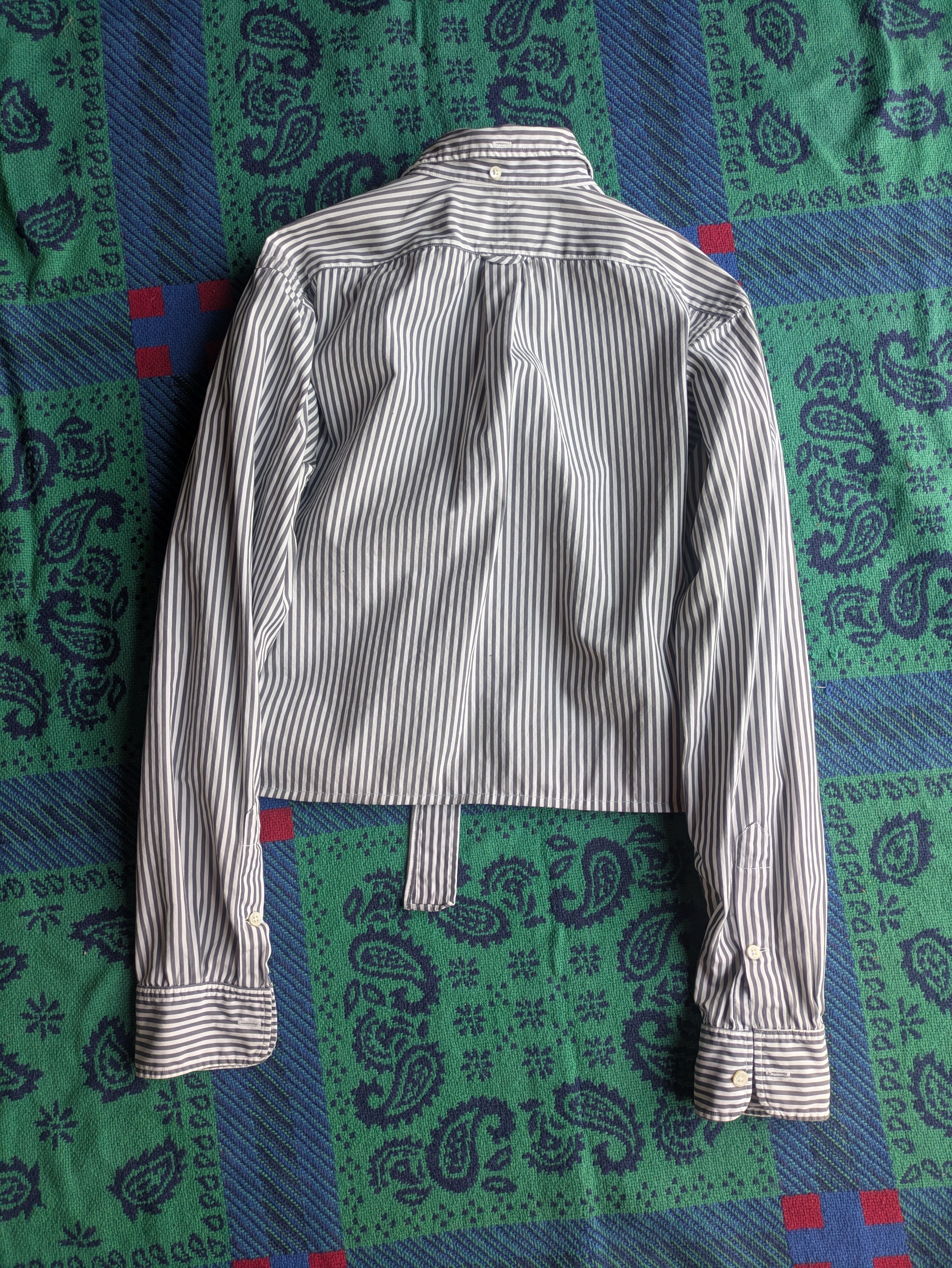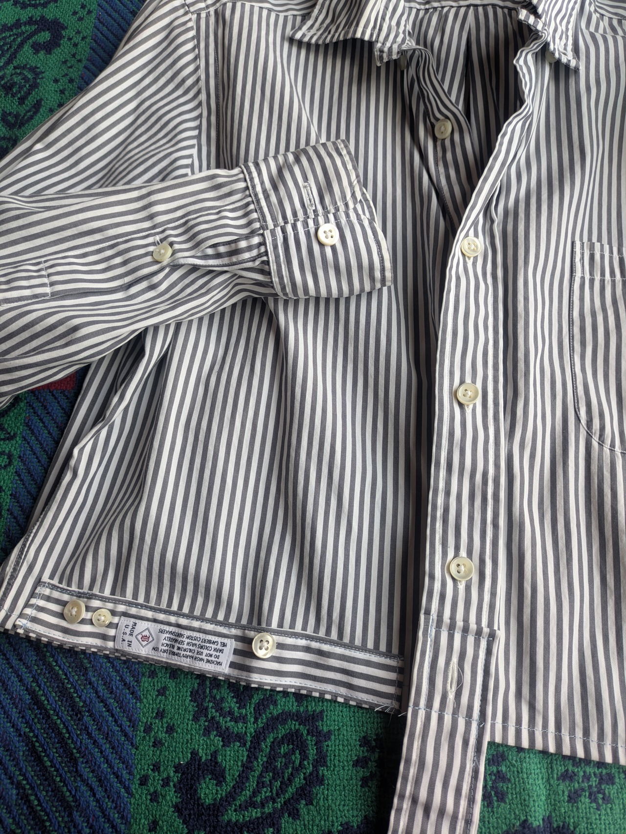 I repurposed a secondhand (used) cotton shirt. The fabric is in good condition overall. I cut off the length and sewed the removed fabric to the hem, allowing for two button fastening options: 1) vertically or 2) horizontally (creating a subtle wrap design ). It would be fun to pair it with sweatpants or a flowy skirt.