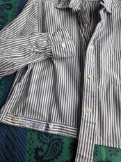 セカンドハンド(Used)のメンズシャツを作り変えてみました。全体的に生地状態の良いシャツです。着丈をカットオフし、切除した生地を裾に縫い付けて2通りのボタンのとめ方ができるようにしました。①縦列でとめる②横列でとめる(ほんのりカシュクールデザインになります)スウェットパンツと合わせたりふんわりした感じのスカートと合わせてみるのも楽しそうです。