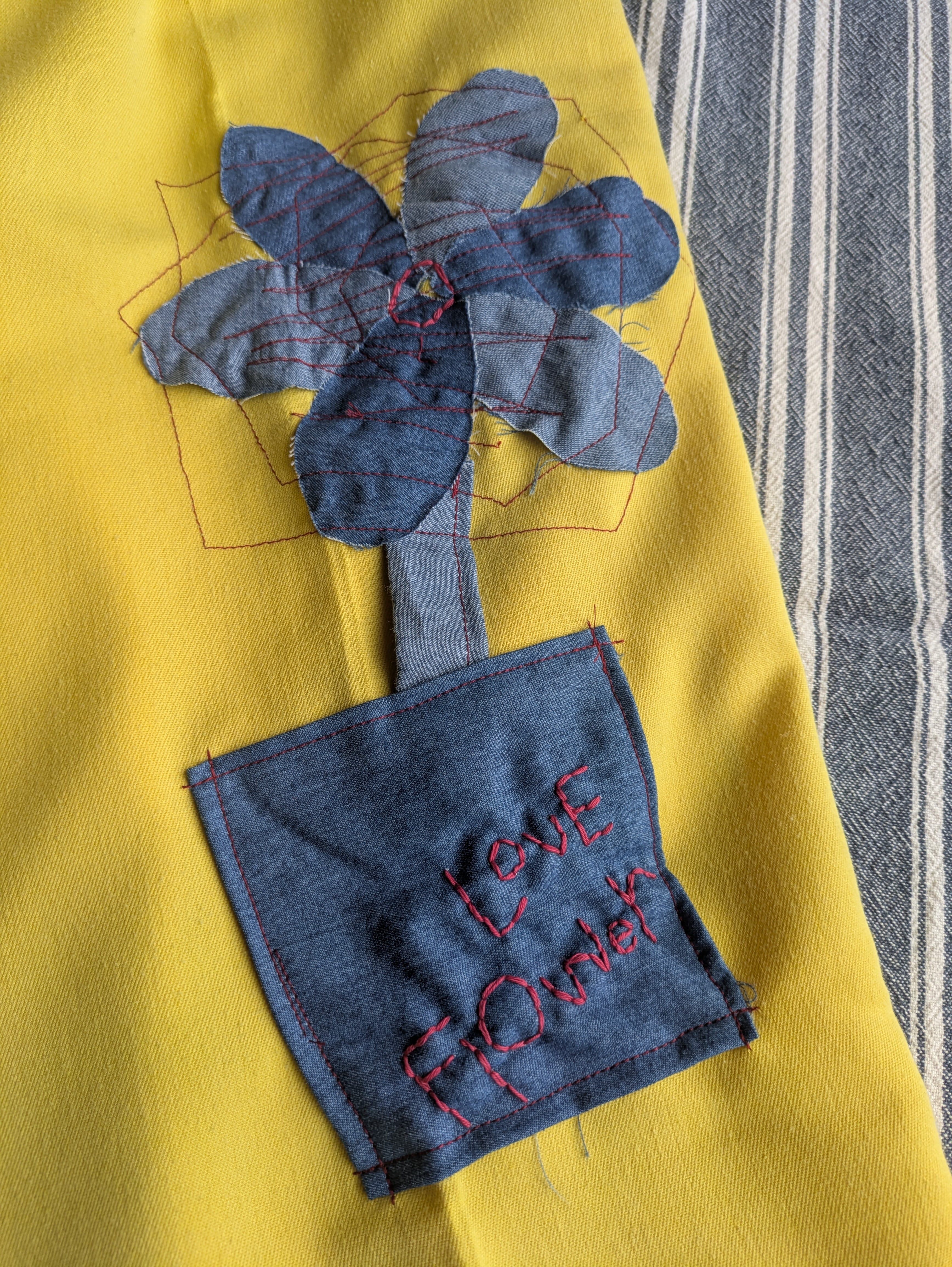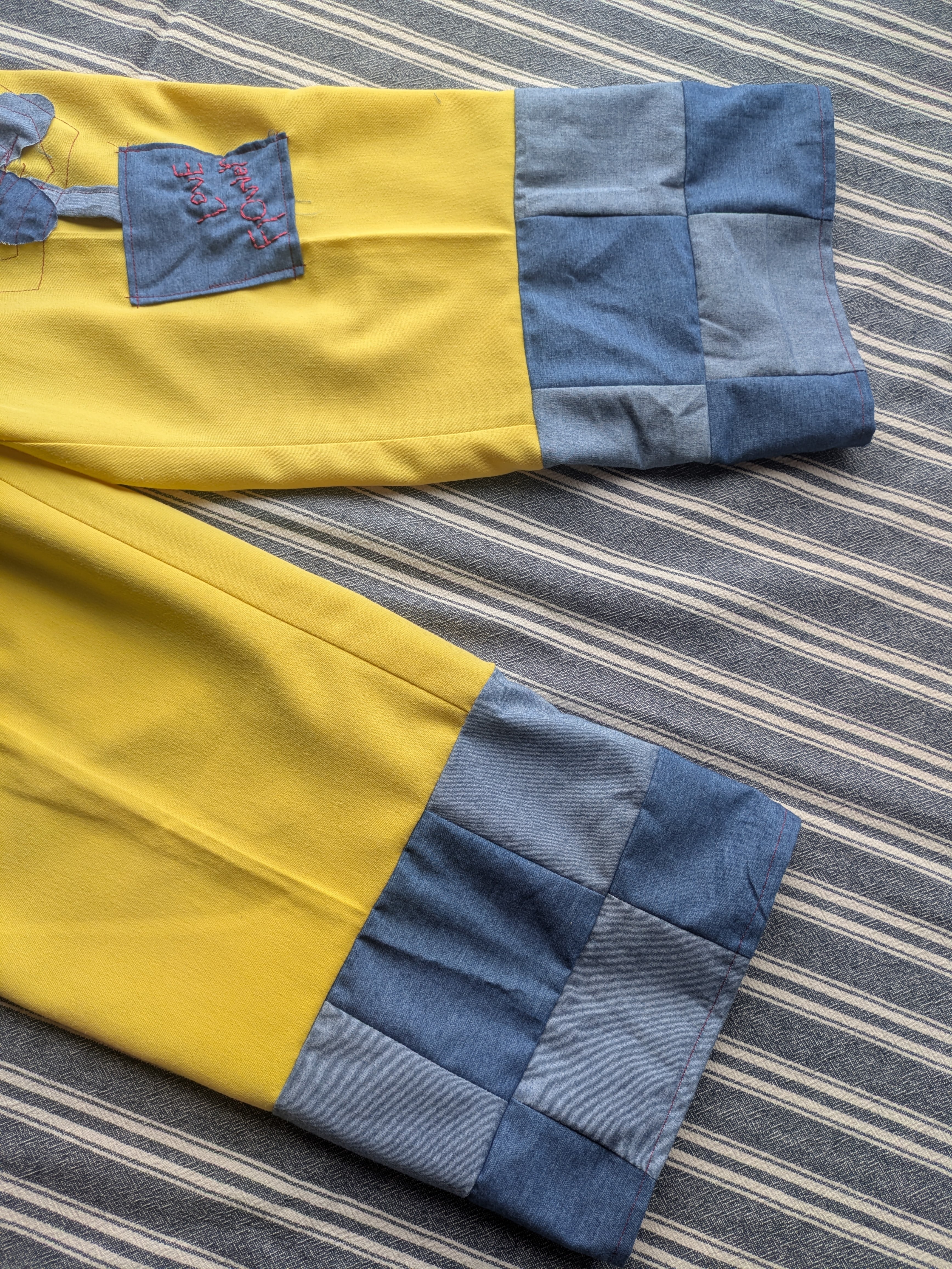 小さなシミ箇所の上にはお花を付けました。お花はLove Flower(愛の花)愛という希望の花。咲かせたいですね。少々生地の疲れがあった裾はカットオフしてパッチワークした生地を縫い付けています。デニムのような色合いの生地もセカンドハンド(Used)のトップス。解体して使用しました。裏地は無いタイプのパンツです。今回チャレンジしてみた裾部分のパッチワーク。たくさん糸を使いましたが..とても面白かったです。繋ぎ合わせる際のカタチや使用する布生地でデザインの幅もさらに拡がりそうだなぁとかんがえていました。また、チャレンジしてみます。おおうら