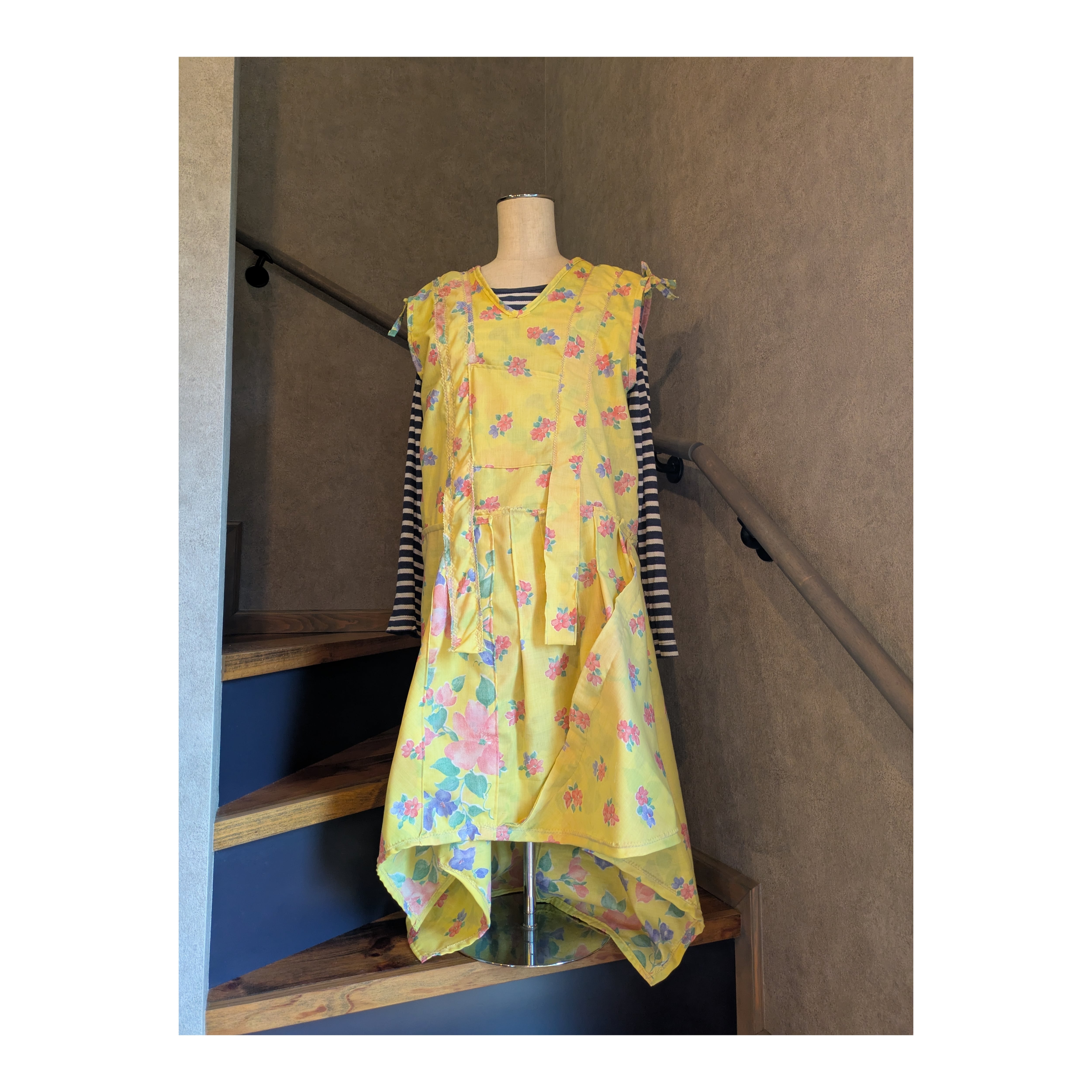 今回は別生地を足すこと無く掛け布団カバー生地のみで製作をするという小さな制約を設けました。上身頃は私物ベストを型紙代わりにして裁断し、スカート部分は生地をトルソーにあててみながら形を考えました。「作りたい形を考え決めてから必要になる素材を揃えて作る」思考方法ではなく「手元に有る(既に有る)素材から作りたい形を考えてみる」思考方法は、冷蔵庫にあるもので何とか献立を考える..あの思考と少し似ているかもと感じます。私にとっては後者の思考方法のほうが、よりわくわくするかも..と感じています。前面と後面の着丈が異なる不思議なチュニックのようなワンピースのような服が生まれた今回。偶然の産物です。